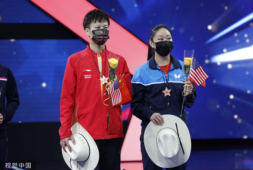 半决赛告负的两对组合同时获得世乒赛铜牌,尽管未能实现争冠目标,但这已是美国选手自1959年以来首次登上世乒赛领奖台。赛前,场外购票的观众排起了“长龙”,这令张安十分欣喜。“希望能激励更多美国运动员,让他们知道,我们也可以打得很精彩,与世界高水平运动员一争高下,”她说,“也希望能有越来越多的美国人关注乒乓球。”